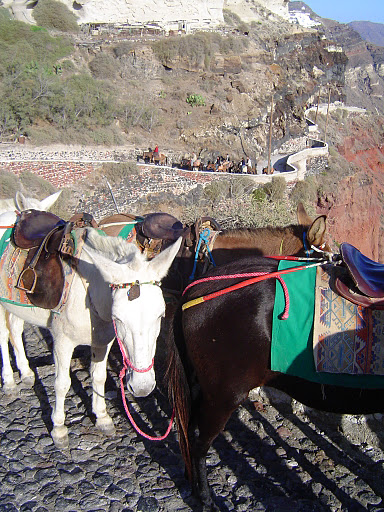 | Donkeys give rides up Santorini’s intimidating steps to cruise ship passengers. Photo by Charish Badzinski |