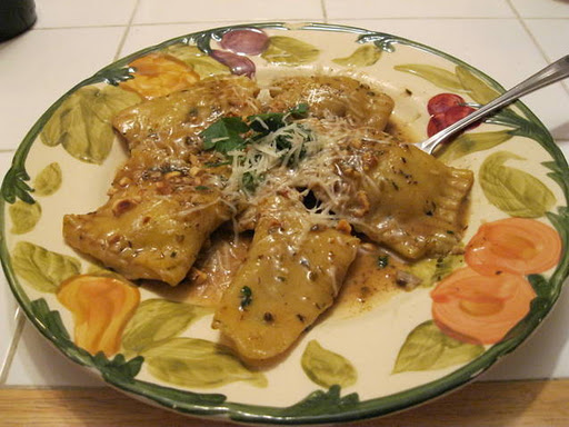 It started with the intention of making something delicious while saving dough. The dish: spinach and wild mushroom ravioli from a Wolfgang Puck cookbook, tossed in brown butter, toasted hazelnuts and freshly-grated parm. How bad could it be?