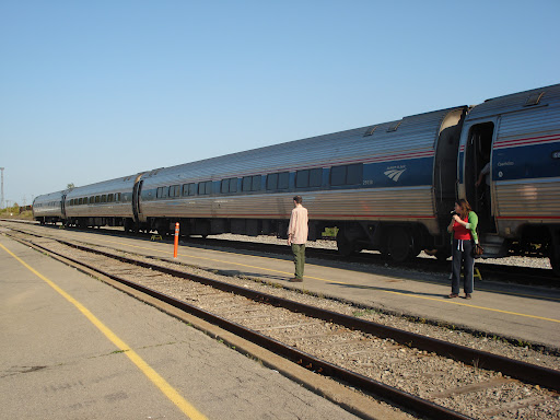 | Passengers step out for a break at an Amtrak train station stop. Photo by Charish Badzinski. |