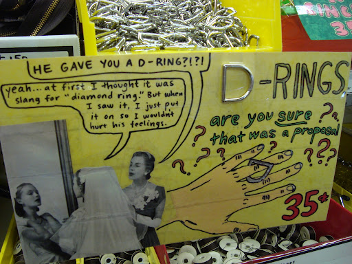| Wouldn’t you love to sit in on their sales and marketing meetings? “I know what will sell these surplus grommets! A mannequin in a kayak, suspended from the ceiling!” Photo by Charish Badzinski. |