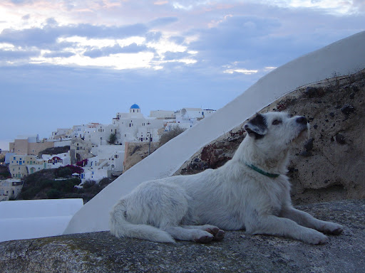 | A dog joins the author in enjoyment of a sunset on the island of Santorini. Photo by Charish Badzinski.Among architectural wonders, discover the magic of an individual moment |