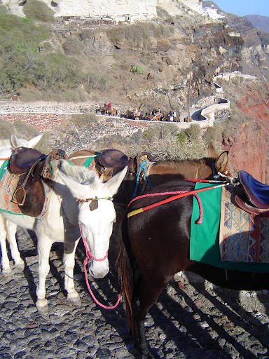 | In the town of Fira, Santorini, visitors can ride a mule up–or down–the nearly 600 steps fromย port to town, for a fee. Photo by Charish Badzinski. |