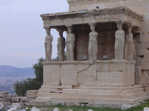 | Caryatids, carved female figures acting as pillars, stare out from the porch of the Erechtheion on the Acropolis in Athens. Photo by Charish Badzinski |