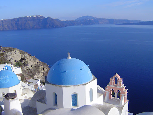 | The island of Santorini is known for its Cycladic blue-domed churches and breathtaking views. For the best views, get a room on the caldera, when you go. Photo by Charish Badzinski. |