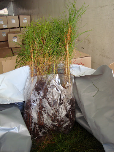 | A shipment of tens of thousands of trees, including douglas fir, lodgepole pine and englemann spruce, awaits planting, which starts today. Photo by Charish Badzinski. |