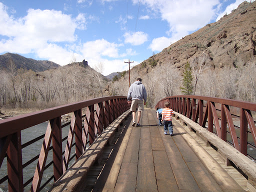 | On a relaxed Saturday, Jason Brey, silviculturist with the U.S. Forest Service, enjoys a walk over the Sweetwater Bridge in Shoshone National Forest with his sons. Photo by Charish Badzinski. |