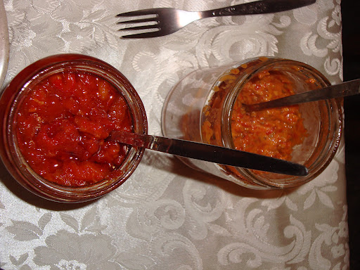 | Homemade vegetable chutneys commonly grace Duja’s table. Pictured here: pindjur and ajvar. Photo by Charish Badzinski. |