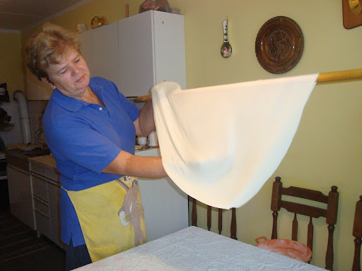 | Duja stretches the dough for burek over a dowel to get it as thin as possible. Photo by Charish Badzinski. |