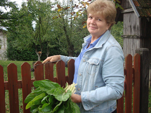 | Dušanka Dojčinović stands at the gate to her garden. The greens in her hand will be prepared and on the table in just hours. Photo by Charish Badzinski. |