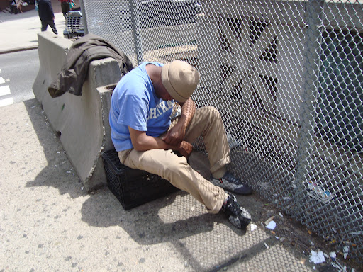 | Maybe down on his luck, maybe just tired, a man naps on the sidewalk in Manhattan in the middle of the day. He did not ask for spare change. Photo by Charish Badzinski. |