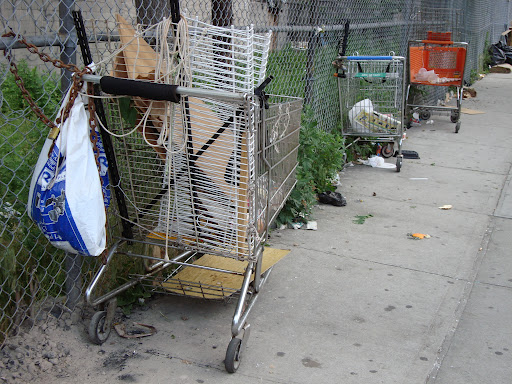 | Shopping carts are chained to a fence in Williamsburg, Brooklyn, protected like prized possessions. Photo by Charish Badzinski. |