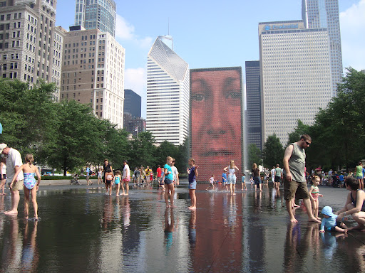 | Crown Fountain in Chicago. The ever-changing faces are strangely creepy, but it’s a fun place to splash around on a hot day. Photo by Charish Badzinski. |