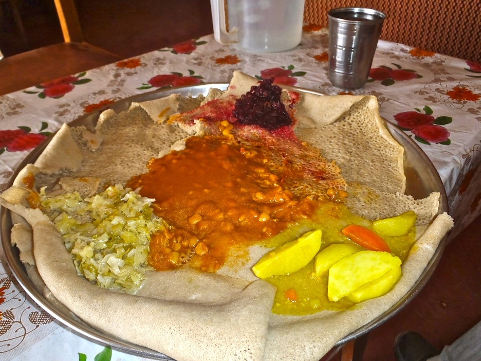 Ethiopian flat “bread” called injera, topped with shiro wat (chickpea stew), cabbage, potatoes, and beets. This is what I eat for lunch almost every day. Photo by Paul Voigt.