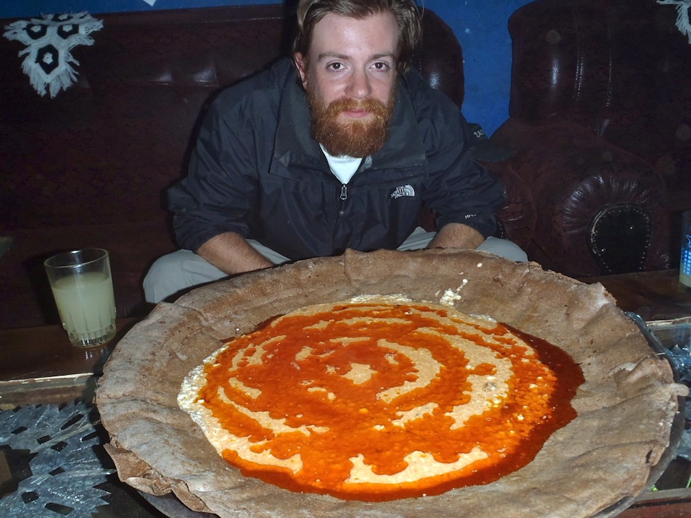 My site mate Adam and I are about to indulge in the dairy delicacy known as chumbo, made from Ethiopian cheese and spicy butter on flat wheat bread. Photo by Paul Voigt.