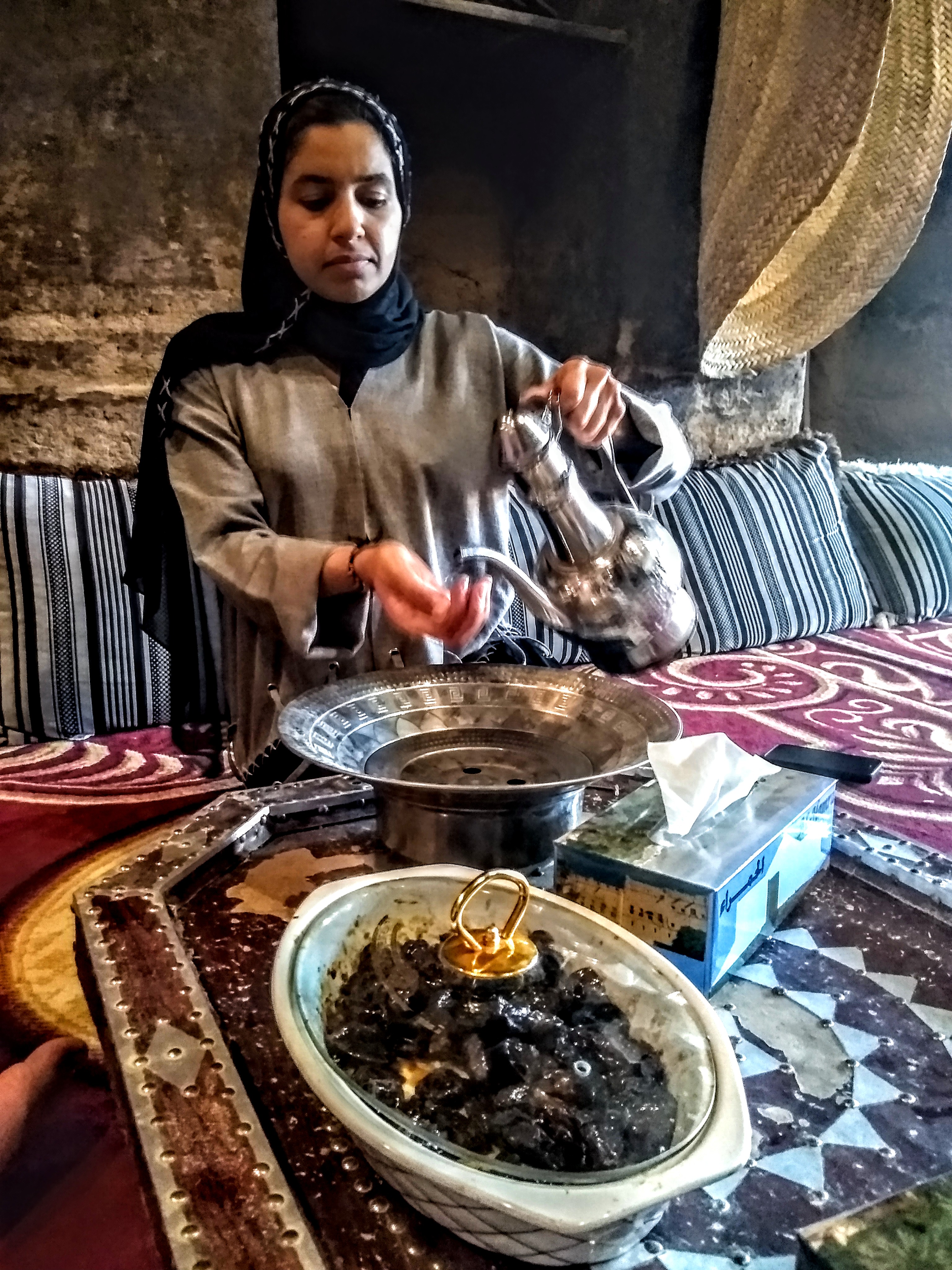 We are at Bait Al Safah, a museum where women have just demonstrated the centuries-old traditional methods of making flatbread and toasting coffee beans.