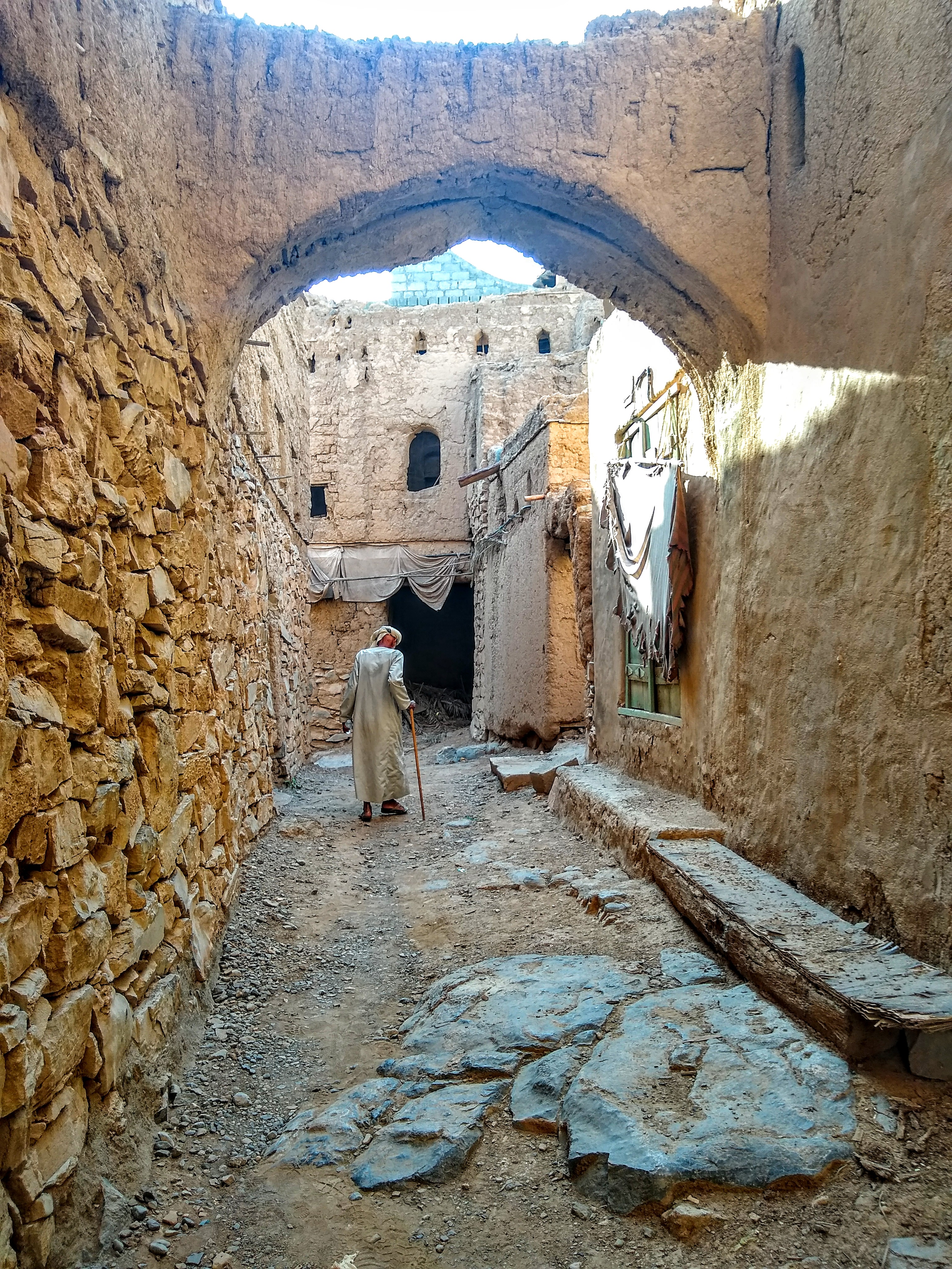 Man walking the sandy streets of Al Hamra. Photo by Charish Badzinski.