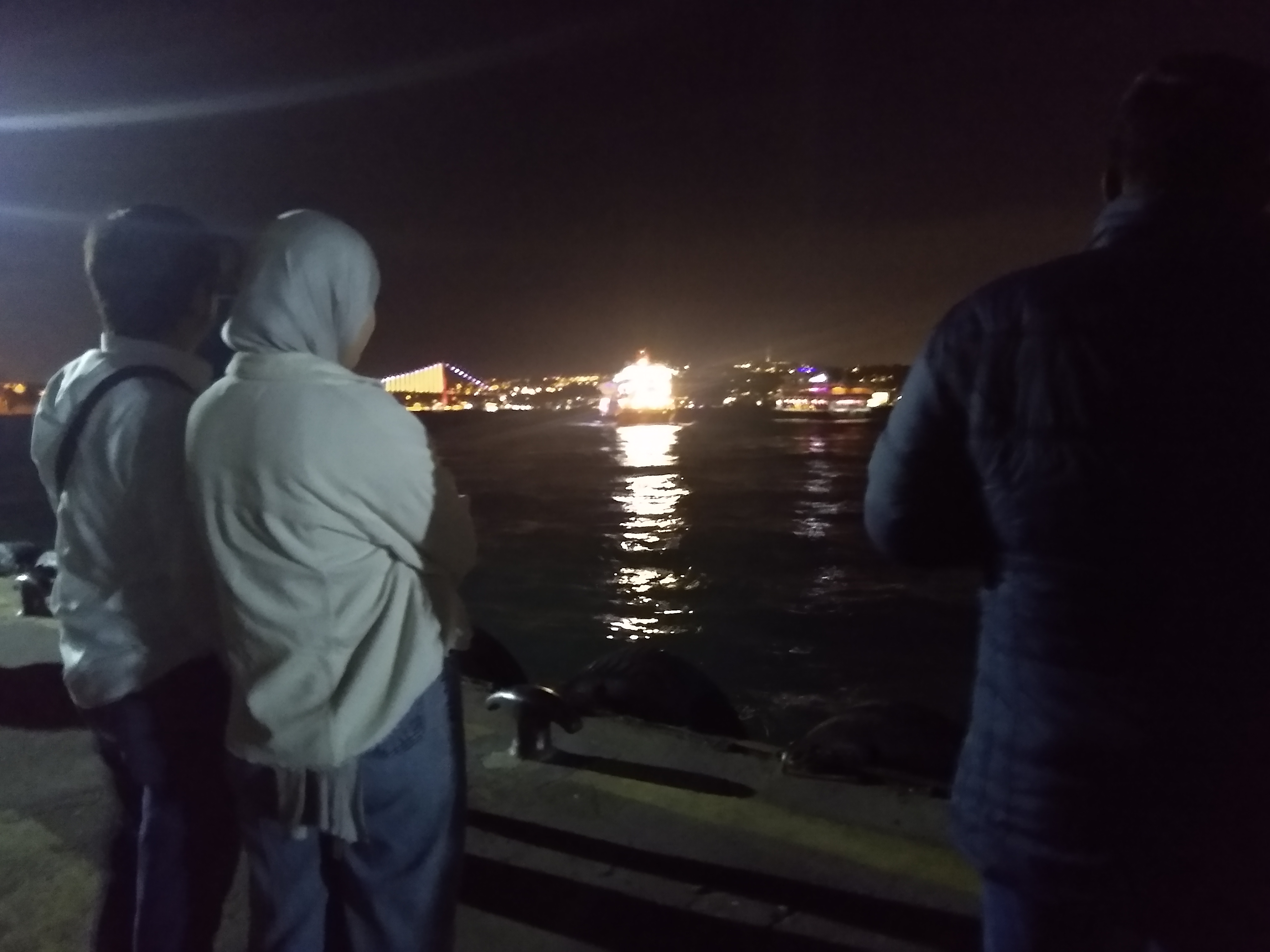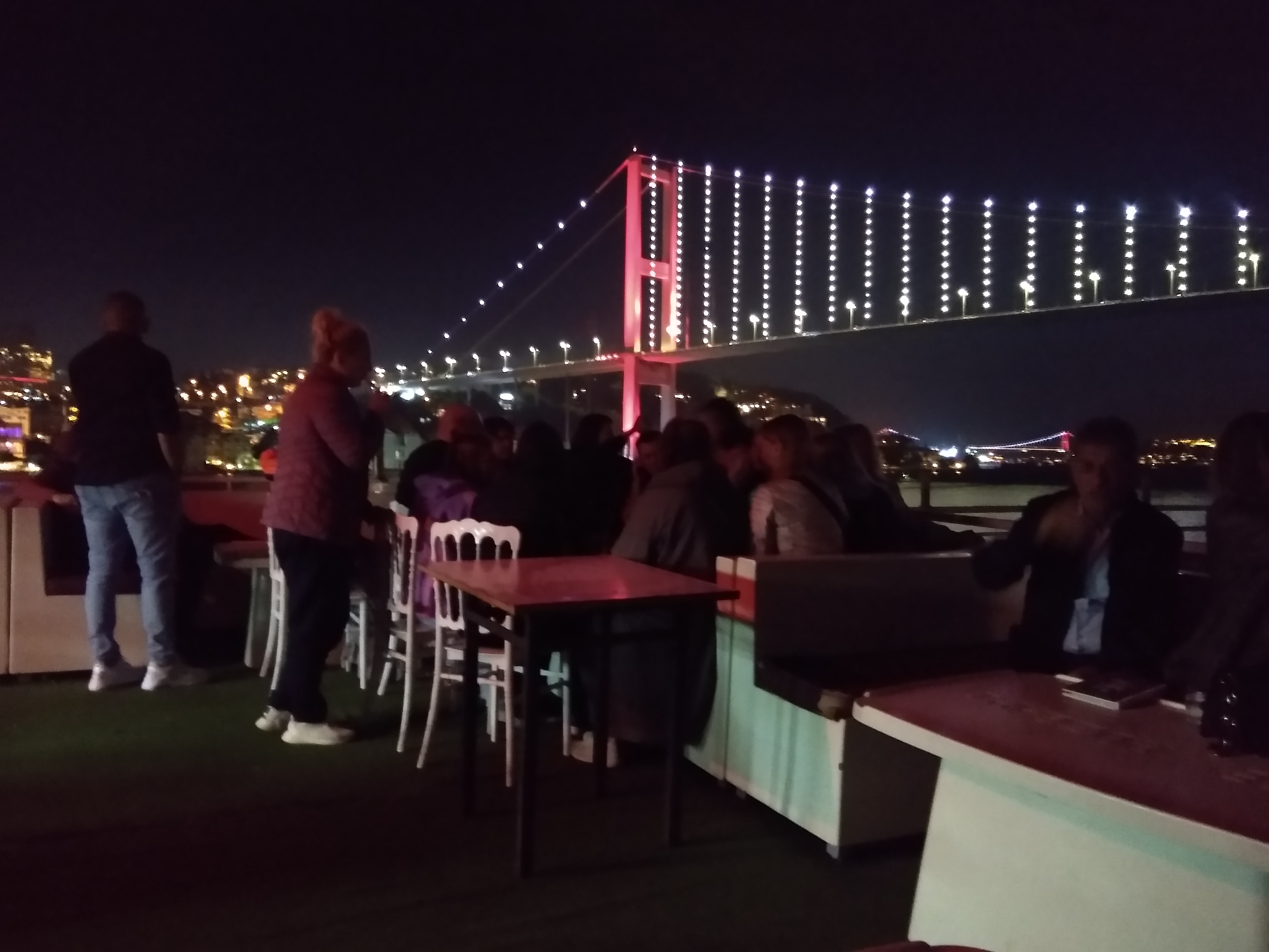 Straddling the border between the Middle East and Europe, I opt to treat myself to an expensive dinner cruise on the Bosphorus Strait. A celebratory farewell. The brochure promises food and drinks and dancing, but the bus is late.
