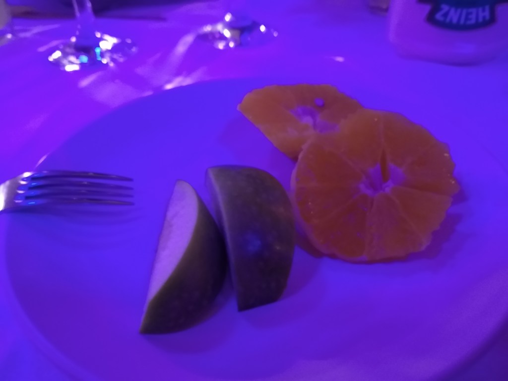 I focus instead on the bartenders and tour guides who have gathered in back and are commiserating, some looking dissociated. A dancer, waiting with disinterest for her next number, twirls a brown tendril of her hair and examines it for split ends. Food appears without fanfare, the music changes and new performers take the place of the others, whose smiles fade from their faces before they even pass our table. We fight to get the waiter’s attention, to have our glasses filled and refilled, which they seem reticent to do. Desert comes, and it’s two slices of orange and two wedges of green apple, followed by children who are trying to sell us ice cream for an additional charge.