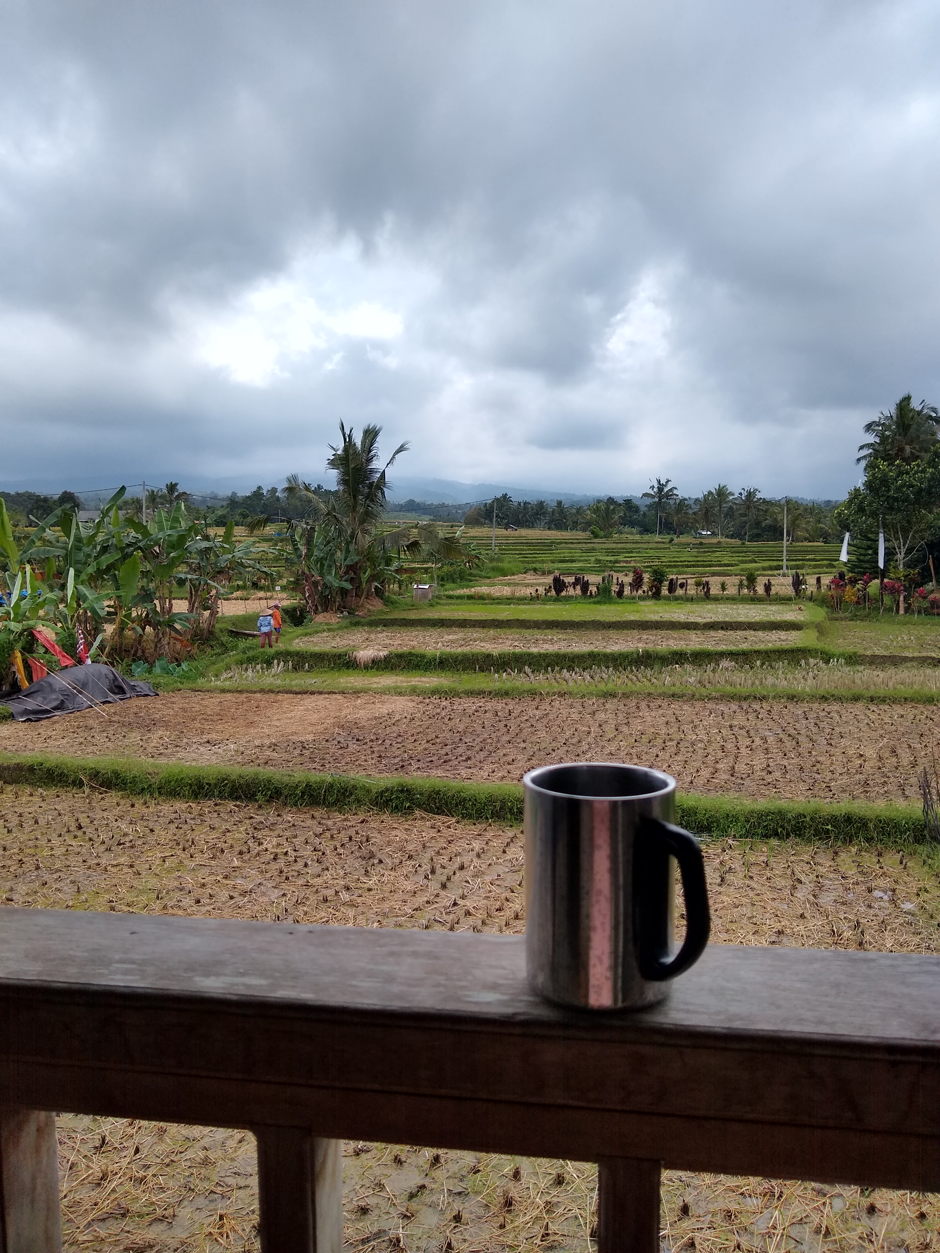 Upon our return and after lunch, we sat on her balcony overlooking the rice fields and volcanoes. I pulled up my father’s photo on my phone, his military photo, where he was young and strong and perhaps fearless. And I turned his face to the idyllic scene. And we drank coffee in silence, and it felt sacred to me. I know Dad would have approved.