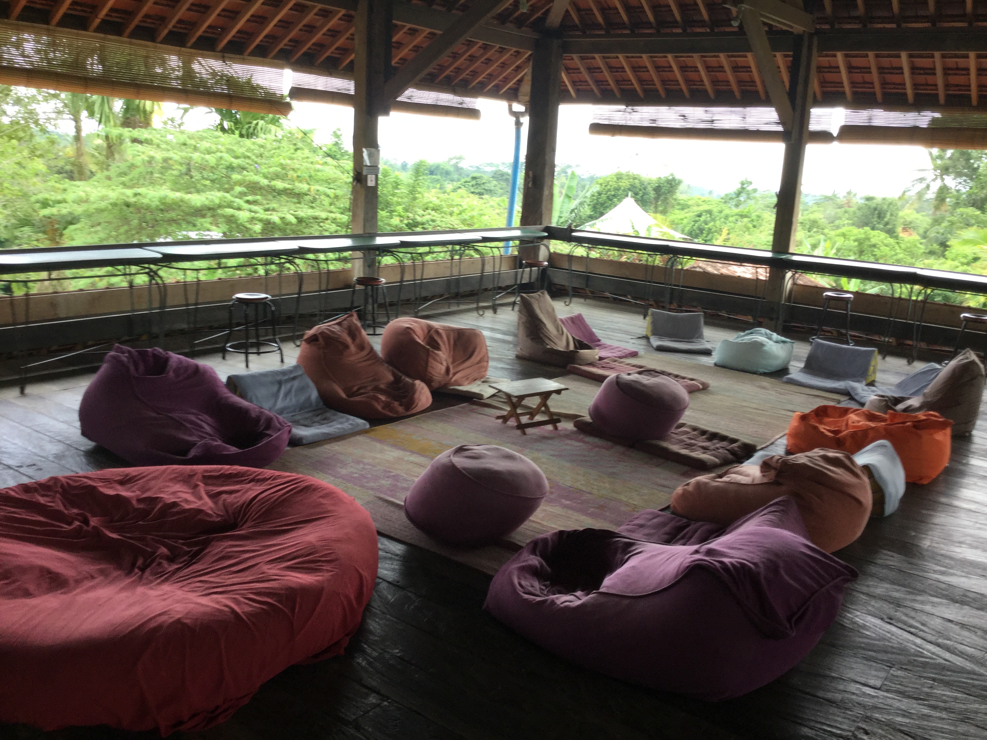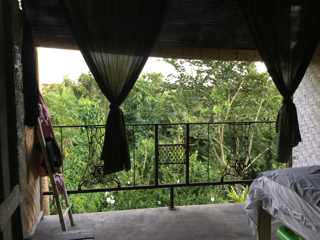 I’d chosen the most ascetic room option at Bali Silent Retreat, an upper-level single room with no fourth wall, just an unobstructed view of the expansive jungle and a screen that could be lowered if needed (current rates $45/night, plus $47 food and programs day pass, and service fees and taxes). That view through the open balcony was what had spoken to me.