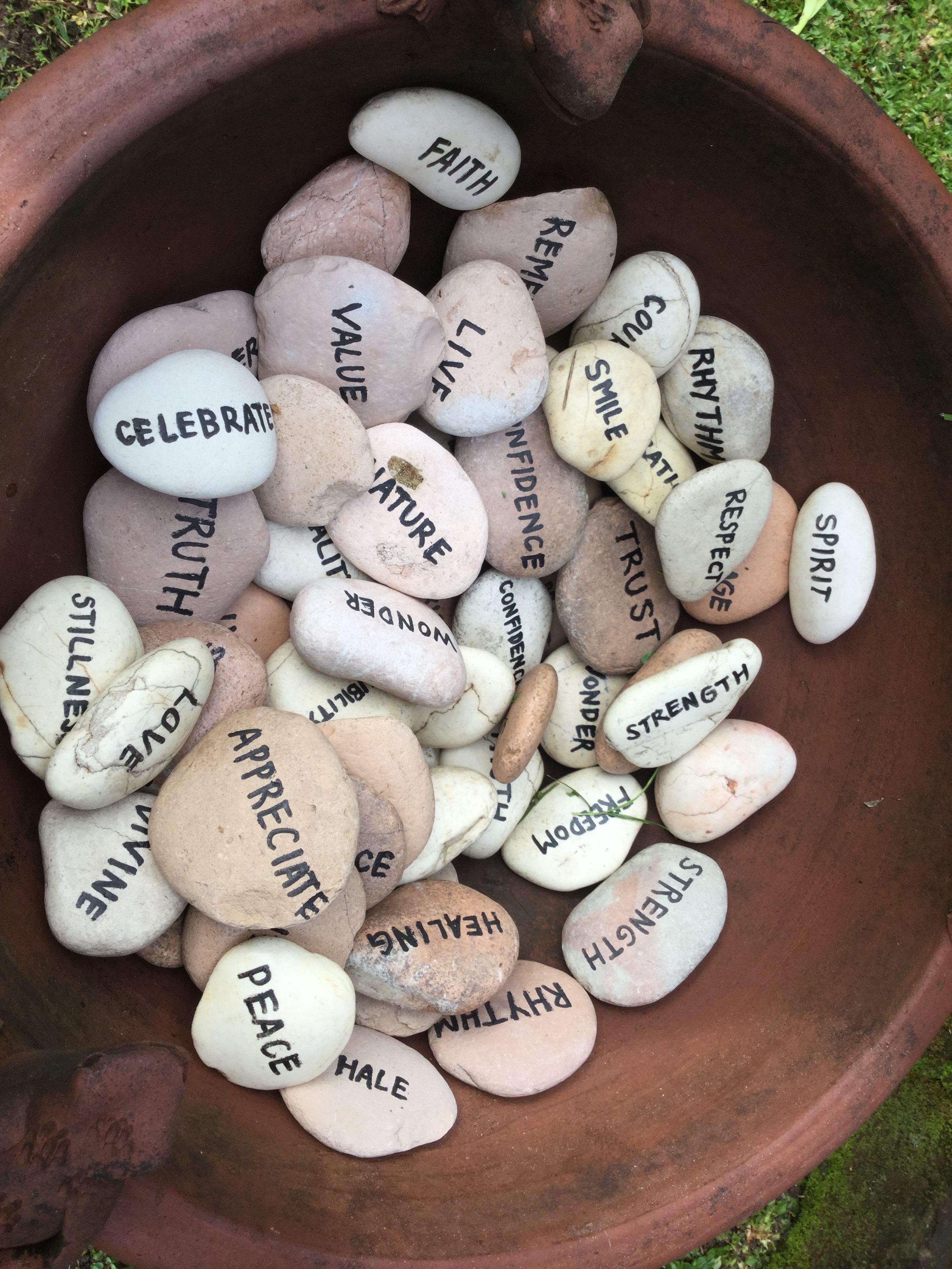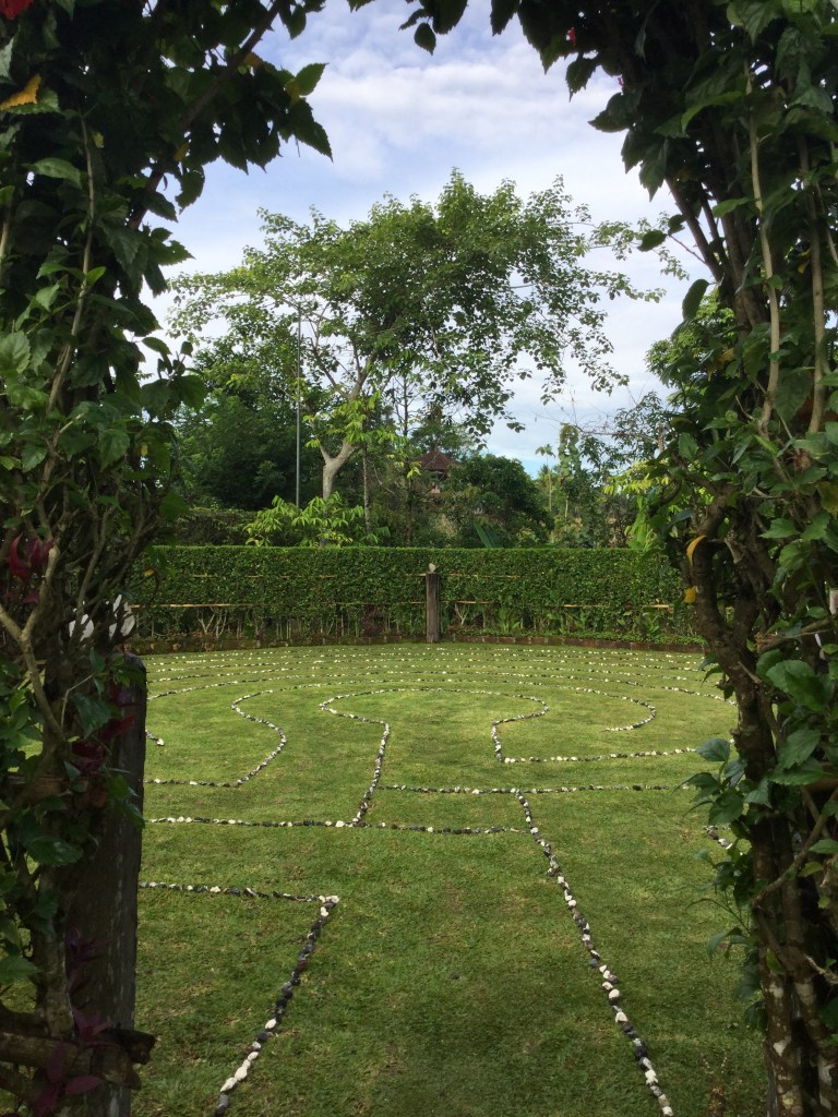The day was overcast and breezy. After breakfast, I walked the labyrinth, newly manicured with every stone freshly scrubbed. I chose two stones for my intentions, marked with the words: peace and healing. I chose them for me. I chose them for all of us. Then I walked to the goddess temple and sat silently under the shower of holy water for some time, wrapped in a pink sarong. And when I was done, I placed a flower on the goddess who had bestowed the baptism upon me.