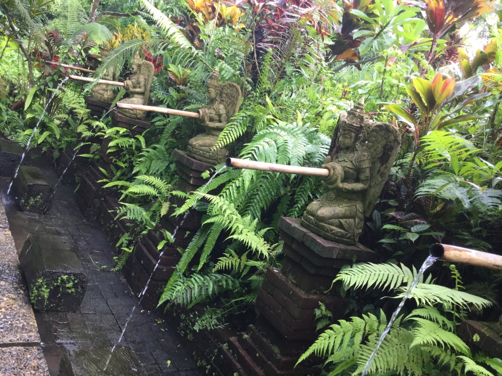 In addition to daily meditation and yoga, which often left me sore, I sometimes walked the crystal labyrinth, or the mosquito-infested jungle pathway to the “crying bench.” But my favorite corner of this quiet part of the world was the outdoor temple for water meditation. I’d carefully choose a sarong from those provided, descend the mossy, slippery steps to the temple and bow my head to clear the greenery that draped over the walkway. The sound of cascading water was the only hymn. Stone goddesses overgrown with moss and plants poured holy spring water onto humble wooden benches. I took a seat and allowed the cold water to splash over my head, willing it to wash away the heaviness I’d gathered over the years, the heaviness we all carried in the wake of our global upheaval.