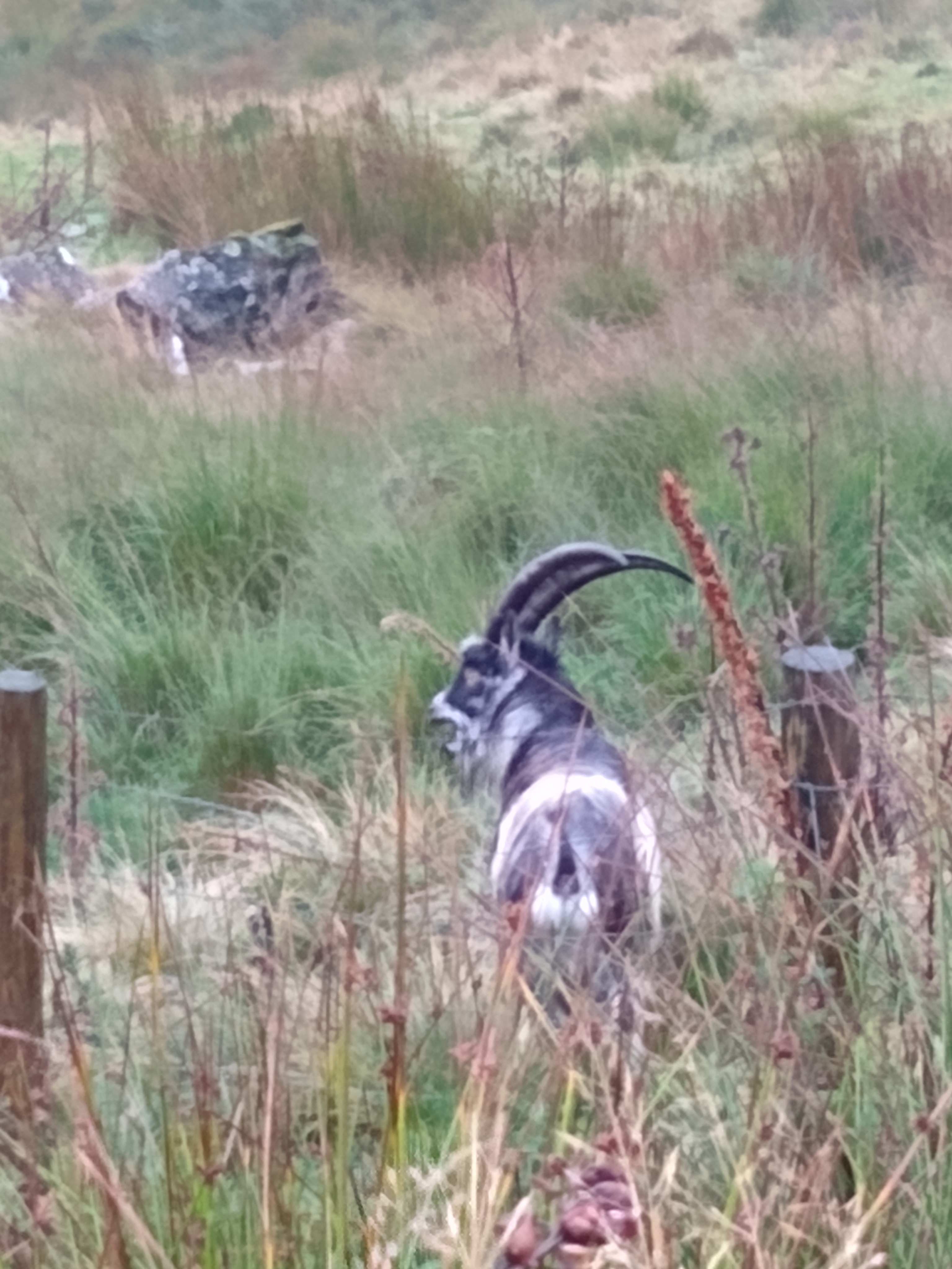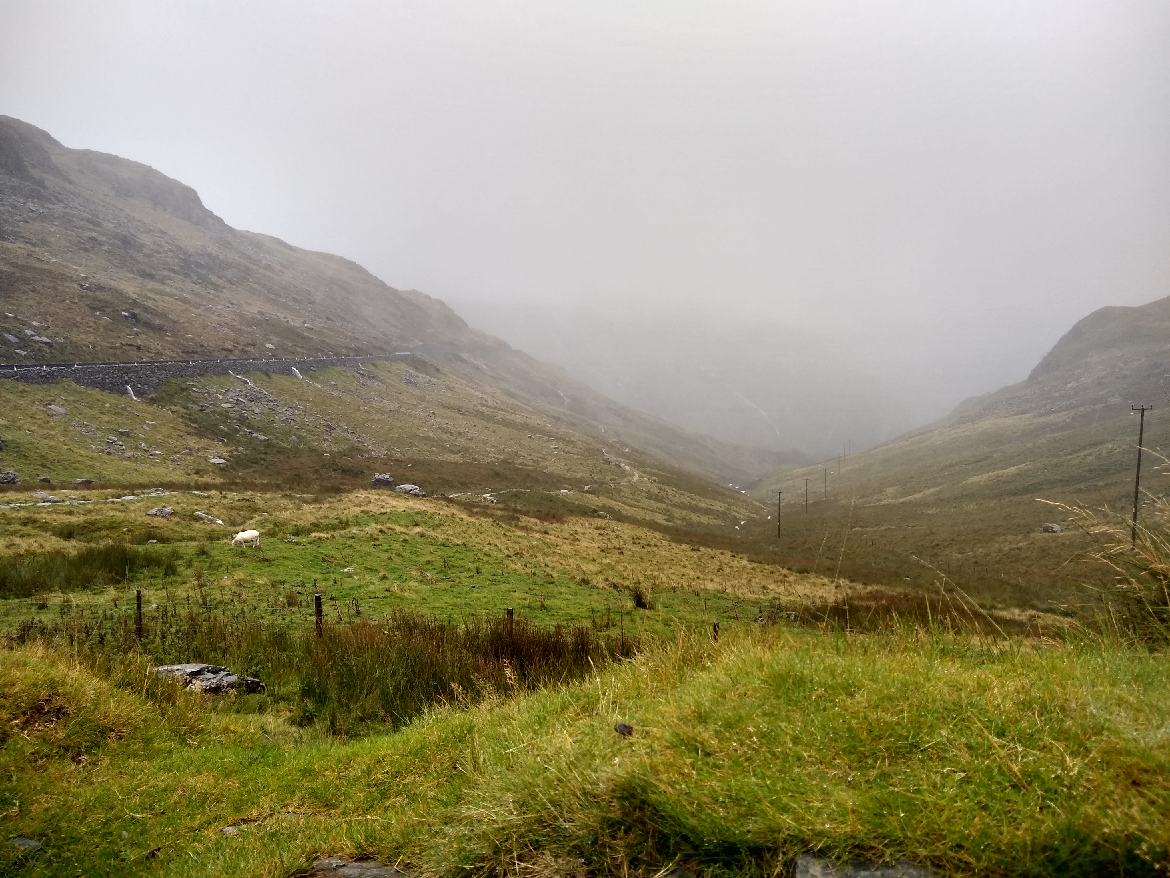 The driver prompts us to jump off at the Pen y Pass stop. We disembark and snap photos, scaring a regal Welsh Mountain Goat with giant arching horns off the trail. He looks wise and magical and turns his dark eyes upon us as if we are diabolical before he disappears into the mist.